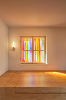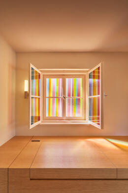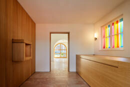 Glasgestaltung der Kastenfenster in den beiden Aufbarungsräumen durch den Künstler Thierry Boissel.