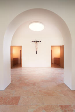 Erweiterung des Innenraums durch Integration des friedhofseitigen Arkadengangs, sowie Wiederherstellung und Neugestaltung der Oberflächen und Einbauten bei behutsamem Umgang mit der bauzeitlichen Bausubstanz.