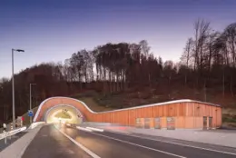 Neuerrichtung der baulichen Massnahmen zur Gesamtgestaltung der Portale am Aubergtunnel. Das ganzheitliche Konzept integriert den Kontext der Umgebung mit den Funktionen von Betriebsgebäude, Tunneleinfahrt und Irritationsschutzwand für die heimischen Fledermäuse.